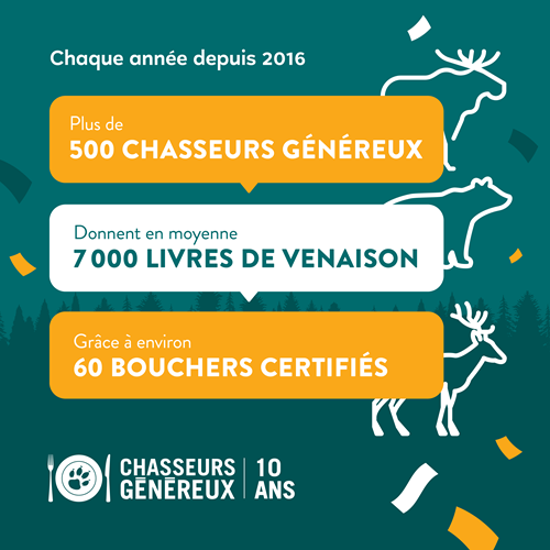 En 2018, pour compléter l’offre du programme et pour encourager les dons substantiels, la FédéCP met sur pied le Fonds Chasseurs généreux. Cet argent sert à payer les frais de débitage lorsque les chasseurs sont prêts à donner une part importante de leur venaison, que ce soit un quartier d’orignal, une demi-bête ou même une bête complète.
