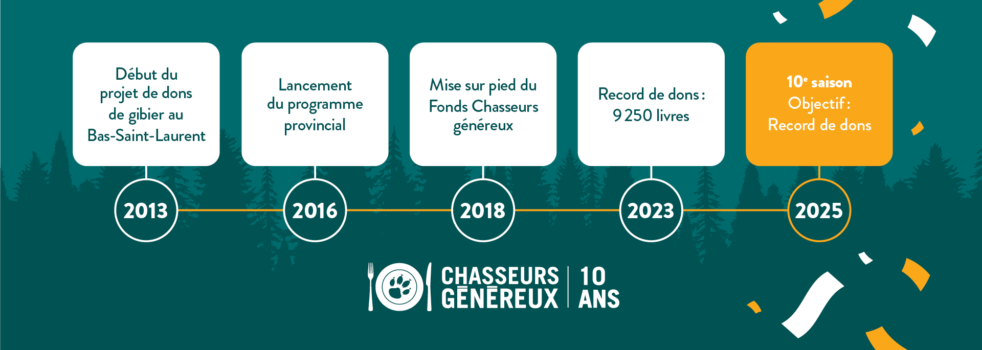En 2013, de véritables chasseurs généreux du Bas-Saint-Laurent s’associent pour inciter leurs compatriotes à donner une portion de leur récolte de gibier à l’organisme d’aide alimentaire de leur région. Ce sont Simon, Claude et Yves Lemay, les propriétaires d’une pourvoirie, accompagnés de Mario Ross, propriétaire d’un magasin de chasse et pêche. Le groupe reçoit l’appui de la Moisson Rimouski-Neigette et de la Fédération québécoise des chasseurs et pêcheurs, par l’entremise de Serge LeRoy Audy, président de la FédéCP régionale du Bas-Saint-Laurent. Au cours des trois premières années, ils contribuent à recueillir plus de 3500 livres de viande dans leur région.