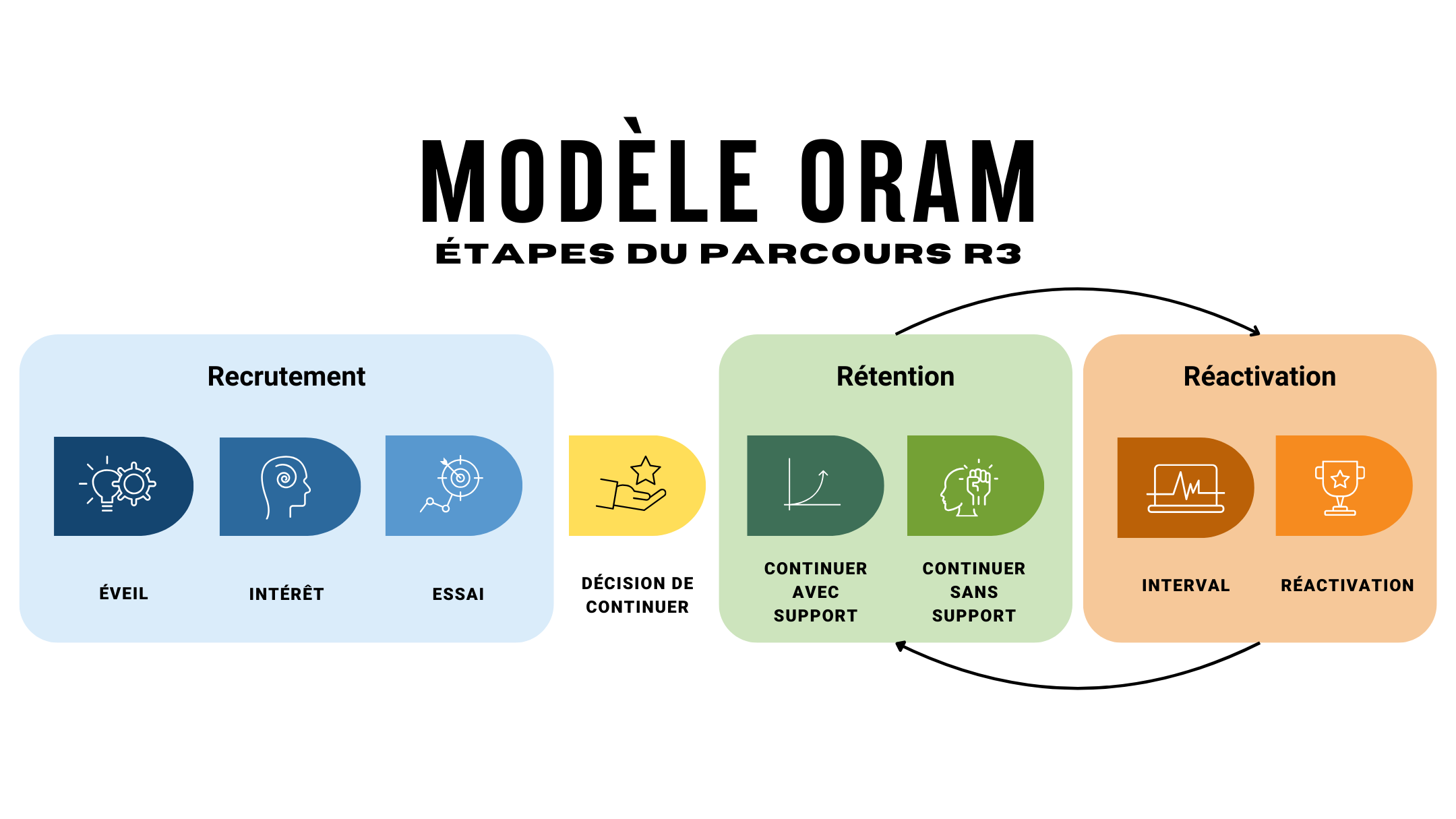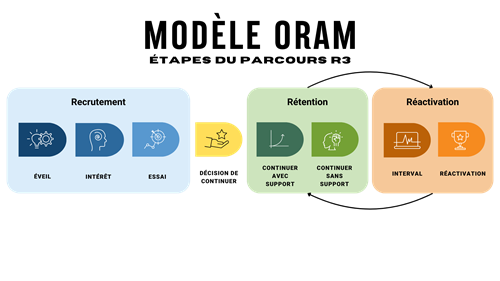 Les véritables efforts R3 se concentrent sur les besoins des individus et le processus requis pour garantir leur adoption et leur participation continue à une nouvelle activité de chasse, de pêche ou de tir sportif. Ce processus spécifique d'adoption des loisirs de plein air est appelé le Modèle d'Adoption des Loisirs de Plein Air (ORAM), et est basé sur plus de cinquante ans de recherches documentant pourquoi et comment certaines activités ou idées sont adoptées par les gens et les cultures. L'ORAM illustre, de manière linéaire, les étapes par lesquelles un individu passe lorsqu'il apprend, essaie puis adopte une nouvelle activité ou un nouveau comportement et peut être utilisé pour comprendre la différence entre le recrutement, la rétention et la réactivation.