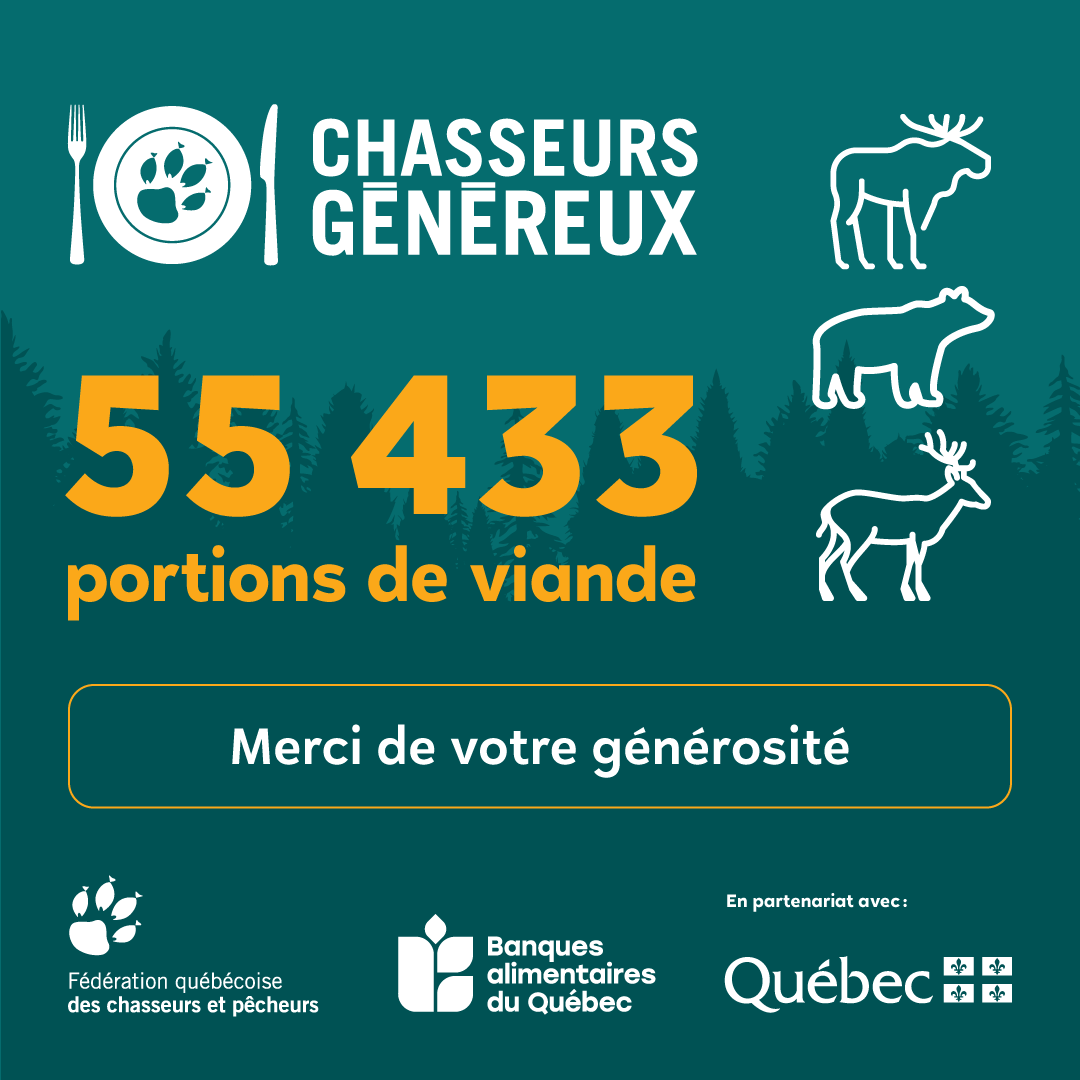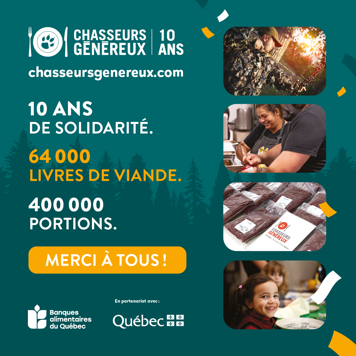 Depuis 2016, le programme Chasseurs généreux a offert plus de 64 000 livres de viande de gibier aux familles québécoises dans le besoin. Cette récolte représente plus de 400 000 portions qui ont été distribuées à travers la province par le réseau de Banques alimentaires du Québec (BAQ).